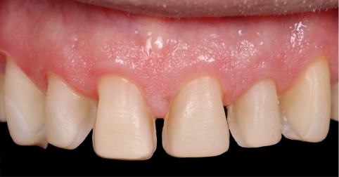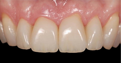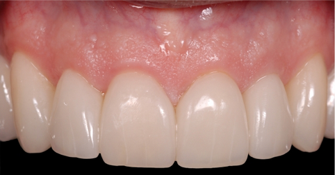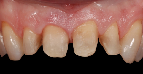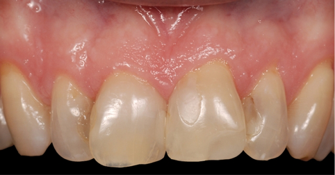 这样的话,技师可以关闭黑三角,同时在从牙体到修复体过度时,能做出一个顺滑的轮廓外形。除此以外,这种情况下,牙体预备时需要将边缘置于龈下,原因也是为了形成一个自然的龈下边缘外形,易于清洁。