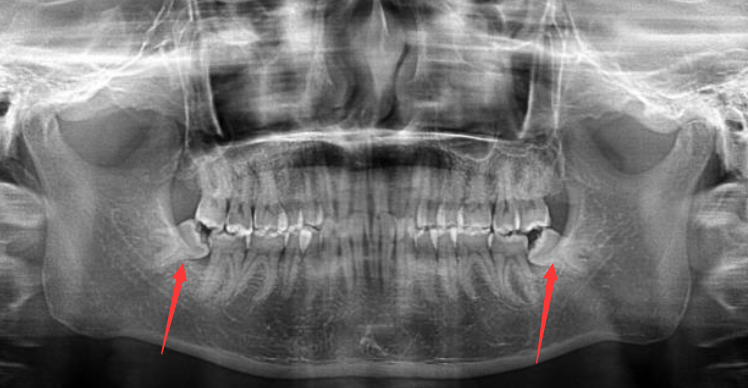 下面是我的牙齿全景图,箭头标的就是下面的两颗阻生齿,死死地顶住旁边正常的牙齿。上下一共四颗,长边的两颗长的还挺端正,先不考虑拔掉。