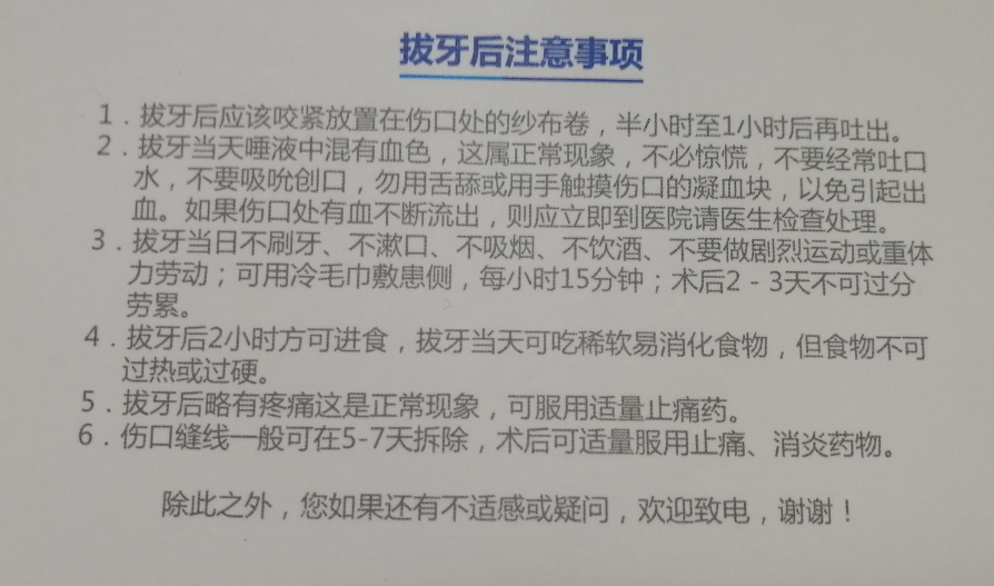 因为我这两颗阻生齿离神经管比较近,拔除会有风险,严重的话会导致半脸失去知觉,听完医生的话后,还是挺害怕的,心里如滔滔江水翻滚不停,万一。。。。。呸呸呸, 谁也不希望有这个万一。 医生给我一份患者拔牙风险知情协议书让我签字, 得知所有拔牙患者都要签协议书的,已经到这个时候,不管那么多了,签吧。。。。(有种签生死状的赶脚 ~.~)