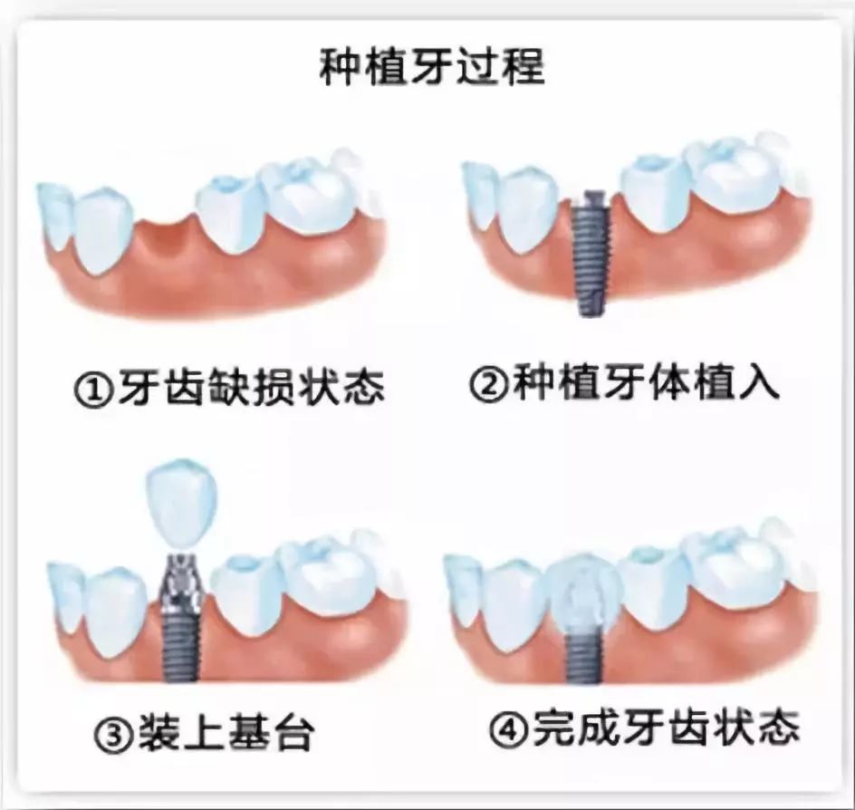 一般情况下,种植牙手术是一个较小的牙槽外科手术,类似拔牙,采用局部麻醉,创伤小,属于微创外科手术,术后即可进食,痛苦很小。一般种植体植入术只需要几十分钟至1小时即可以完成。由于选用的是与人体相容性极好的生物材料,种植牙对人体不会产生任何的不良反应。即使种植体的骨整合失败,取出后可以等伤口愈合后改进方法再种植,或改做普通义齿。因此,即使种植义齿失败,后果也并不可怕。